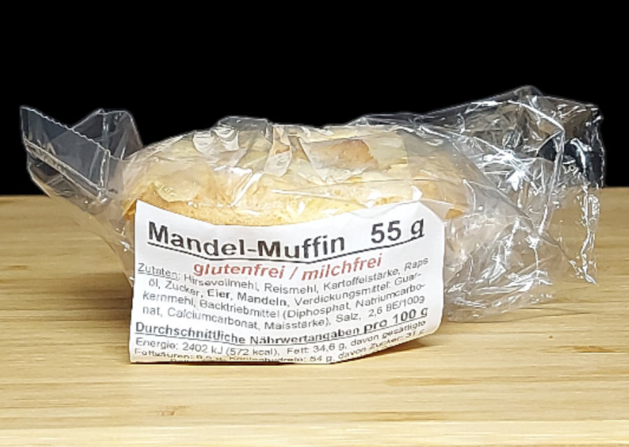 Hirse, Reis, Kartoffelstärke, Rapsöl, Zucker, Eier, Mandeln, Verdickungsmittel: Guarkernmehl, Backtriebmittel (Diphosphat, Natriumcarbonat, Calciumcarbonat, Maisstärke), Salz